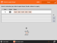Il se peut qu'il n'y ait pas de bourrage papier à l'endroit indiqué, même dans ce cas, vérifiez tous les autres emplacements indiqués dans les instructions affichées à l'écran. L'écran indiquant qu'il y a un bourrage papier s'affiche de manière répétée jusqu'à ce que vous ayez éliminé le bourrage papier. Si vous appuyez sur <Fermer> sur l'écran indiquant un bourrage papier, l'opération peut continuer avec les réglages sélectionnés sans correction immédiate du bourrage papier. Ne retirez pas le papier d'un emplacement autre que celui qui est affiché comme emplacement de bourrage papier à l'écran. Cela peut causer des bourrages papier dans d'autres emplacement ou des pages manquantes dans les documents imprimés. |