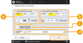 Vous ne pouvez pas configurer les paramétrages pour le rapport de gestion de communication si <Afficher le journal des tâches> dans <Réglages de gestion> est réglé sur <Non>. De plus, si vous changez <Afficher le journal des tâches> dans <Réglages de gestion> de <Non> à <Oui>, <Impr./envoyer Nb spéc. transm.> et <Impr./envoyer à heure spécifiée> dans le rapport de gestion de communication change à <Non>. <Afficher le journal des tâches> |