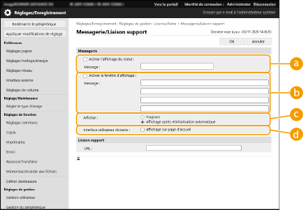 Pour faire apparaître le message dans la partie inférieure de l'afficheur tactile, cochez la case, puis saisissez le message dans [Message]. Utilisez cette fonction pour afficher des astuces de fonctionnement ainsi que des messages d'importance secondaire.