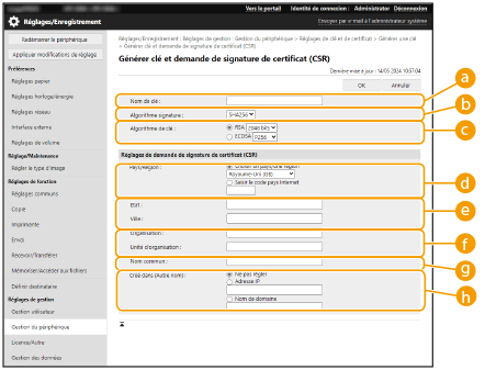 Les certificats générés sur cet appareil n'ont pas de signature CA , ce qui peut causer des erreurs de communication avec certains pairs de communication. Pour demander un certificat avec une signature CA, des données de demande de signature de certificat (CSR) sont requises. Un utilisateur qui se connecte avec des privilèges Administrateur peut générer une CSR.