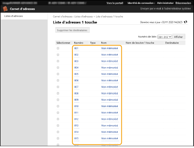 [Liste d'adresses pour administrateurs] n'est disponible que pour les administrateurs qui se connectent avec les privilèges Administrateur ou DeviceAdmin.