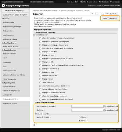 sélectionnez le niveau de sécurité dans [Niveau de sécurité] cliquez sur [Lancer l'exportation]