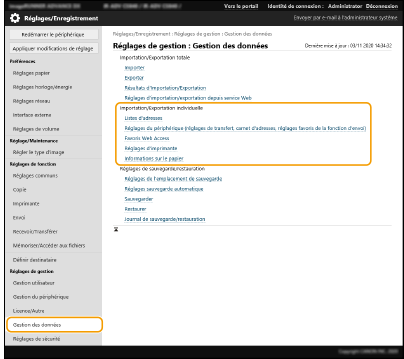 1 | Cliquez sur [Réglages du périphérique (réglages de transfert, carnet d'adresses, réglages favoris de la fonction d'envoi)] dans [Importation/Exportation individuelle]. |