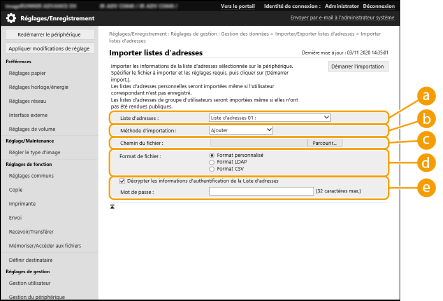 3 | Configurez les réglages nécessaires. ![]() [Listes d'adresses]Sélectionnez la liste d'adresses qui est la destination d'import. [Méthode d'importation]Sélectionnez [Ajouter] si vous voulez ajouter les destinations importées sans supprimer la liste d'adresses actuelle ou sélectionnez [Supprimer et remplacer] si vous voulez supprimer la liste d'adresses actuelle et écraser les données avec les destinations importées. [Chemin du fichier]Cliquez sur [Parcourir...], et sélectionnez le fichier à importer. [Format de fichier]Sélectionnez le format de fichier des données à importer. Sélectionnez [Format personnalisé] pour les fichiers dans le format dédié pour les imprimantes multifonctions Canon (*.abk), sélectionnez [Format LDAP] pour les fichiers de format LDAP (*.ldif), ou bien sélectionnez [Format CSV] pour les fichiers de format CSV (*.csv). [Décrypter les informations d'authentification de la Liste d'adresses]Lors de l'import de fichiers cryptés, cochez la case et saisissez le même mot de passe que celui qui a été saisi quand les données de réglage ont été exportées. Si vous utilisez l'appareil multifonction de la série imageRUNNER ADVANCE prenant en charge la fonction fax, vous ne pouvez pas enregistrer les adresses fax G3 et fax IP sur cet appareil. |
