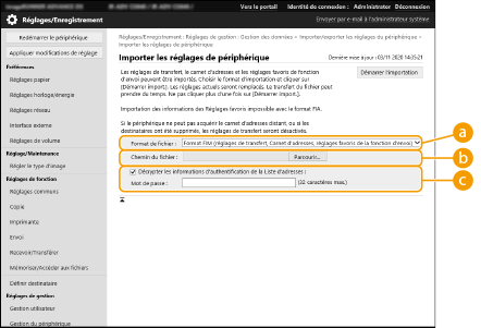 3 | Configurez les réglages nécessaires. ![]() Le carnet d'adresses actuel est supprimé et écrasé par les informations du carnet d'adresses importé. Lors de l'importation, aucune opération ne peut être exécutée sur l'interface utilisateur distante jusqu'à ce que la machine redémarre. En outre, les réglages importés deviennent valides après avoir redémarré l'appareil. Mise hors tension/redémarrage de l'appareil ![]() [Format de fichier]Sélectionnez le format de fichier des données de réglage à importer. Notez que le format de fichier varie en fonction du modèle d'imprimante multifonctions qui a exporté les données. Vérifiez le fichier à importer. [Chemin du fichier]Cliquez sur [Parcourir...], et sélectionnez le fichier à importer. [Décrypter les informations d'authentification de la Liste d'adresses]Lors de l'import de fichiers cryptés, cochez la case et saisissez le même mot de passe que celui qui a été saisi quand les données de réglage ont été exportées. |