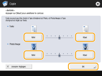 Appuyez sur <Elevé> pour régler le niveau de sorte que le texte et les lignes soient copiées avec netteté, ou appuyez sur <Faible> pour copier les demi-teintes de manière plus uniforme sur les images imprimées, etc.
