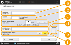 <Code PIN>Définissez un mot de passe pour la boîte. Saisissez un nombre de sept chiffres au maximum, appuyez sur <Confirmer>, saisissez le même mot de passe et appuyez ensuite sur <OK>.