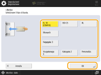 2 | Selezionare il tipo di buste. ![]() Per registrare una busta in formato personalizzato, premere <Personalizz.> <Avanti> quindi <X> o <Y> per specificare il lato, quindi utilizzare i tasti numerici per inserire la lunghezza del lato specificato. |