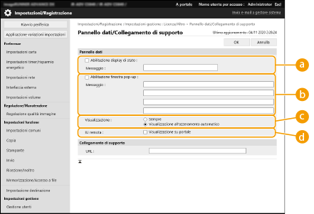 ![]() | È possibile visualizzare messaggi agli utenti sul pannello digitale. I messaggi possono essere visualizzati sul fondo del pannello digitale oppure in una finestra a comparsa separata, ed è possibile selezionare il metodo di visualizzazione da usare sulla base del tipo di messaggio o di utente. Quando un messaggio viene visualizzato in una finestra a comparsa, è possibile visualizzare lo stesso messaggio anche sulla pagina del portale IU remota. Sono necessari i privilegi di amministratore per configurare queste impostazioni. |