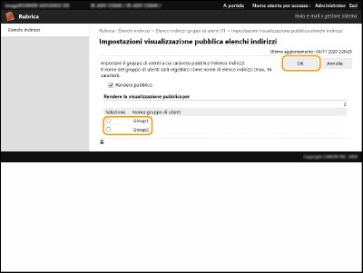 È possibile stabilire di cambiare anche il nome della rubrica del gruppo di utenti quando si cambia un nome di un gruppo di utenti. Accedere alla IU remota come utente con privilegi di amministratore, premere [Impostazioni/Registrazione] [Impostazione destinazione] [Impostazioni elenco indirizzi personale/elenco indirizzi gruppi di utenti] e selezionare la casella di controllo [Applicazione variazione Nome gruppo di utenti a nome Elenco indirizzi gruppi di utenti]. [Applicazione variazione Nome gruppo di utenti a nome Elenco indirizzi gruppi di utenti] è disponibile solo quando è attivata la gestione autenticazione personale.