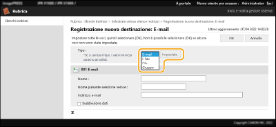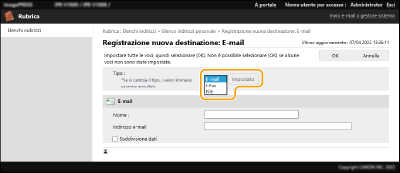 Le voci visualizzate variano a seconda del tipo di destinazione. Per maggiori informazioni sulle informazioni da registrare, vedere Registrazione delle destinazioni nella Rubrica.