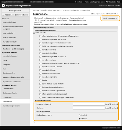 selezionare il livello di sicurezza da [Livello di protezione] fare clic su [Avvio esportazione]