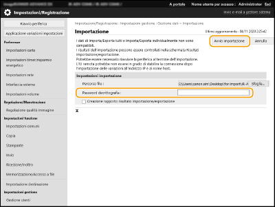Inserire la password in [Password decrittografia] e fare clic su [Avvio importazione]