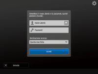 | | Con questo metodo, gli utenti accedono inserendo il nome utente e la password con la tastiera visualizzata sul pannello comandi. Questo metodo è disponibile indipendentemente dal dispositivo di autenticazione utilizzato. |