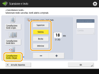 ![]() | Quando si acquisiscono originali più piccoli del formato di scansione, nell'immagine acquisita possono apparire delle righe del riquadro degli originali. Quando si acquisiscono libri spessi, possono apparire bordi scuri. Questa funzione consente di cancellare le righe del riquadro e i bordi scuri. Inoltre, è possibile impostare la macchina affinché non copi i fori negli originali. |