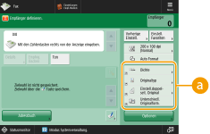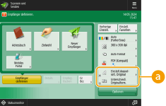 Die Anzahl der Einstellungselemente auf dem Grundfunktionsbildschirm und die angezeigte Position hängen von den Funktionen ab. Eine Schnelltaste wird nicht angezeigt, wenn <Nicht zugeordnet> als Tastaturkürzel eingestellt ist. Die Anzahl der registrierbaren Schnelltasten für <Optionen> ist wie folgt begrenzt. Kopieren (Regulär): 5 Kopieren (Express): 6 Scannen und Senden: 2 Wenn Sie den Grundfunktionsbildschirm zum Kopieren auf den Expresskopie-Bildschirm umgeschaltet haben (Schnelles Ändern der Einstellungen (Express-Kopierbildschirm)), wählen Sie die Taste im Schritt 3 aus und drücken Sie dann <Speichern>. |