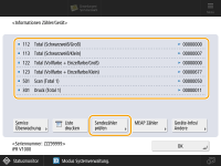 Drücken Sie <Service Überwachung> <Kommunikationstest>, um die Kommunikation mit dem Remote-Überwachungsserver zu überprüfen. Wenn diese Funktion ausgeführt wird, werden regelmäßig Informationen über das Gerät an den Remote-Überwachungsserver gesendet. Um diese Funktion nutzen zu können, ist es erforderlich, die Kommunikation zwischen dem Gerät und dem Server, der den Dienst bereitstellt, zu aktivieren.Sie können eine Liste ausdrucken, auf der die Anzahl der für Kopier-, Druck- und Scanvorgänge verwendeten Seiten aufgeführt ist. Auf diesem Bildschirm können Sie auch die Zählerinformationen für die jeweilige MEAP-Anwendung überprüfen. Drücken Sie <MEAP Zähler> auf dem Bildschirm im Schritt 2. Wenn Sie <Geräte-Infos/Andere> <Konfig. Gerät prüfen> auf demselben Bildschirm drücken, können Sie die im Gerät installierten Optionen und die Version des Sicherheitschips für die Speichergeräte-Datenverschlüsselung überprüfen.Informationen zu den Zählbedingungen erhalten Sie bei Ihrem Händler oder Kundendienst. Informationen zur <Service Überwachung> erhalten Sie bei Ihrem Händler oder Kundendienst. |