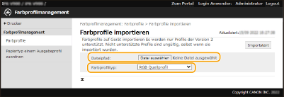 Es werden nur Farbprofile der ICC-Version 2 unterstützt und können importiert werden. Auch wenn ein nicht unterstütztes Profil importiert und verwendet wird, wird das Profil nicht angewendet.