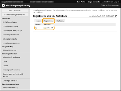 Wählen Sie das CA-Zertifikat, das Sie registrieren möchten, und klicken Sie dann auf [Registrieren...].