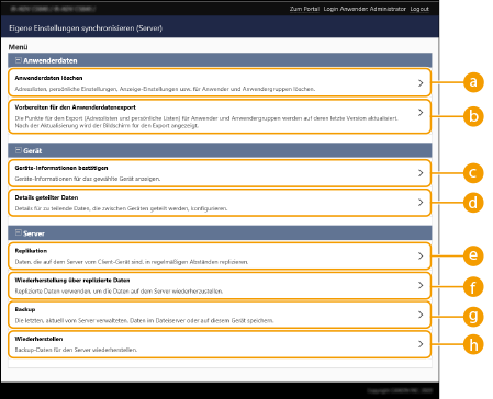 Sie können den Umfang der Freigabe für die Datensynchronisierung festlegen und die zu synchronisierenden Geräte verwalten. Sie können Benutzerdaten löschen und Synchronisierungsdaten sichern und wiederherstellen. Diese Einstellungen gelten nur für das Servergerät oder das Server/Clientgerät.