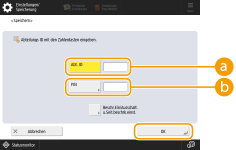 2 | Drücken Sie <Speichern>. ![]() So bearbeiten Sie die Einstellungen der Abteilungs-ID Wählen Sie die Abteilungs-ID aus, die Sie bearbeiten möchten, und drücken Sie <Bearbeiten>, um den Bearbeitungsbildschirm anzuzeigen. So löschen Sie die Einstellungen der Abteilungs-ID Wählen Sie die Abteilungs-ID aus, die Sie löschen möchten, und drücken Sie <Löschen> <Ja>. |