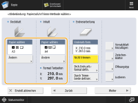 2 | Wählen Sie die Kopiereinstellungen in <Vorderes Vorsatzblatt> und <Hinteres Vorsatzblatt> aus <OK> drücken.Drücken Sie <Unbedruckt lassen>, wenn nicht auf das Vorsatzblatt kopiert werden soll. Wenn Sie Papier für das Vorsatzblatt aus der "Zuschiesseinheit R" zuführen, wählen Sie <Unbedruckt lassen>. Um das Papier für das Vorsatzblatt festzulegen, drücken Sie <Ändern> unter <Papier wählen> Die Papierzufuhr auswählen <OK> drücken. |