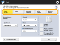 ![]() | Wenn Sie Dokumente mit vertraulichen Informationen kopieren, können Sie unsichtbaren Text, wie beispielsweise "STRENG GEHEIM" oder "VERTRAULICH" einbetten, um unbefugte Benutzer davor zu warnen, diese zu kopieren. Wenn Sie ein Dokument kopieren, das bereits kopiert wurde, wird der eingebettete Text über die gesamte Seite angezeigt, sodass unbefugte Kopien von Kopien verhindert werden. Systemoptionen Je nach Art des verwendeten Gerätes ist diese Funktion standardmäßig verfügbar. |