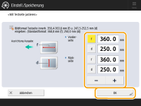 <f>: | Geben Sie die gemessene Länge von 'f' auf der Testseite ein. Für das Banner: Geben Sie den Eingabewert ein, der aus der gemessenen Länge der Markierung 'f' auf der Testseite des Banners berechnet wurde. Eingabewert = ((Standardwert für 'f': 360 mm)/gemessene Position von 'f': 450, 550, 650 mm)) x gemessener Wert von 'f' |