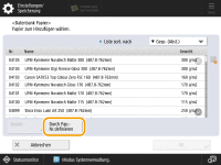 Sie können die Auswahlliste nach Speicherdatum, Namen oder Basisgewicht in auf- oder absteigender Reihenfolge sortieren. Detailinformationen zum ausgewählten Papier können angezeigt werden, indem Sie <Details> drücken Wenn Sie Papiertypen auswählen und speichern möchten, die auf anderen Seiten angezeigt werden, können Sie die Seiten mit [  ]/[  ] umschalten. |