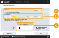 Wenn Sie die Einstellung von <Zeitzone> oder <Sommerzeit> geändert haben, müssen Sie das Gerät durch Ausschalten der Stromversorgung neu starten. Drücken Sie zum Ausschalten den Netzschalter ( Ausschalten des Geräts), warten Sie mindestens 10 Sekunden, nachdem die Bereitschaftsanzeige erloschen ist, und schalten Sie dann das Gerät wieder ein ( Einschalten des Geräts). |
