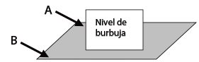 Uniformidad del suelo | Coloque una placa de suelo en el suelo donde se vaya a instalar el equipo y coloque el nivel simplificado en el centro de la misma. Para que la placa de suelo quede horizontal, inserte algunos espaciadores (monedas) debajo de A o B de la placa de suelo, como se muestra en la ilustración siguiente. Calcule la uniformidad del suelo a partir del grosor del espaciador y el número de ellos. ![]() Método de cálculoUtilice monedas que tengan el mismo grosor que un espaciador. Cada parámetro se especifica del siguiente modo: t (mm): el grosor del espaciador a: el número de los espaciadores introducidos en A b: el número de los espaciadores introducidos en B Cuando a > b, la uniformidad del suelo se calcula mediante la siguiente fórmula. t x a (mm) EjemploLas monedas de 1 mm de grosor se utilizan como espaciadores. Si se insertan dos espaciadores debajo de A y no se inserta nada debajo de B para hacer que la placa del suelo quede horizontal, la uniformidad del suelo es de 2 mm. | ||