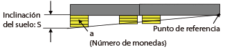 Método de cálculoUse monedas que tengan el mismo grosor que un espaciador. Cada parámetro se especifica de la siguiente manera. t (mm): el grosor del espaciador a: el número de espaciadores La uniformidad del suelo se calcula mediante la siguiente fórmula. S = t x a (mm) EjemploLas monedas de 1 mm de grosor se utilizan como espaciador. Si se insertan tres espaciadores debajo de la posición más alejada del punto de referencia, la inclinación del suelo es de 3 mm (= 1 mm x 3). |