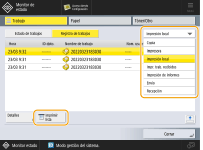 (Monitor estado/Cancelar) aparece la pantalla Monitor de estado, que le permite consultar el historial de uso de cada función, tales como copia, impresión, envío por correo electrónico, envío/recepción de I-faxes, etc. Desde esta pantalla, también puede imprimir el historial de uso para cada función.![]() |