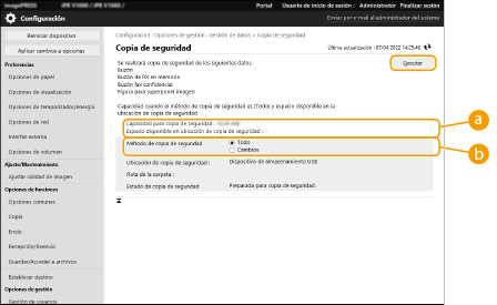 No modifique ni elimine los datos de los que se ha hecho una copia de seguridad, ya que podría impedir la correcta restauración de los mismos. No realice una copia de seguridad mientras el equipo está siendo manejado desde el panel de control o la IU remota. |