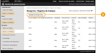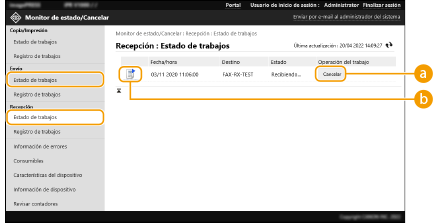 Puede utilizar la IU remota para consultar el estado de documentos que están a la espera de ser procesados, así como los registros de los documentos que se han procesado. También puede consultar el estado del equipo, como la información de errores y la cantidad restante de consumibles.