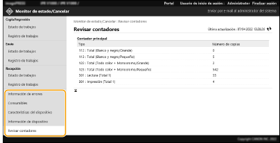 Puede consultar diversa información sobre el equipo, tal como información de errores, la cantidad de papel y de tóner restante, información sobre el equipamiento opcional conectado y el número total de páginas que se han impreso hasta el momento.