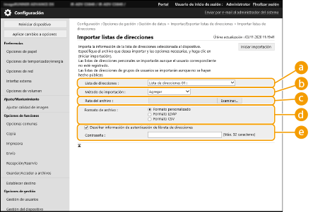 3 | Configure las opciones necesarias. ![]() [Listas de direcciones]Seleccione la lista de direcciones que es el destino de importación. [Método de importación]Seleccione [Agregar] si desea añadir los destinos importados sin eliminar la lista de direcciones actual, o seleccione [Eliminar y sobrescribir] si desea eliminar la lista de direcciones actual y sobrescribir los datos con los destinos importados. [Ruta del archivo]Haga clic en [Examinar...] y especifique el archivo para importar. [Formato de archivo]Seleccione el formato de archivo de los datos que se van a importar. Seleccione [Formato personalizado] para los archivos en el formato específico de las impresoras multifunción Canon (*.abk), seleccione [Formato LDAP] para los archivos con formato LDAP (*.ldif) o seleccione [Formato CSV] para los archivos con formato CSV (*.csv). [Descifrar información de autenticación de libreta de direcciones]Al importar archivos cifrados, seleccione la casilla de verificación e introduzca la misma contraseña introducida al exportar los datos de configuración. Si utiliza equipo multifunción de la serie imageRUNNER ADVANCE compatible con la función de fax, no podrá registrar en este equipo las direcciones de fax G3 y fax IP. |