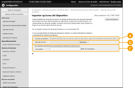3 | Configure las opciones necesarias. ![]() La Libreta de direcciones actual se elimina y se sobrescribe con la información de la Libreta de direcciones importada. Al importar, no se puede realizar ninguna operación en la IU remota hasta que se reinicie el equipo. Por otra parte, las opciones importadas surten efecto tras reiniciar el equipo. Apagar/reiniciar el equipo ![]() [Formato de archivo]Seleccione el formato de archivo de los datos de configuración que se van a importar. Tenga en cuenta que el formato de archivo varía según el modelo de impresora multifunción que ha exportado los datos. Compruebe el archivo que se va a importar. [Ruta del archivo]Haga clic en [Examinar...] y especifique el archivo para importar. [Descifrar información de autenticación de libreta de direcciones]Al importar archivos cifrados, seleccione la casilla de verificación e introduzca la misma contraseña introducida al exportar los datos de configuración. |