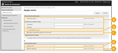 [Asociación a grupo de usuarios]Si desea asignar al usuario a un grupo, seleccione un grupo de usuarios registrado de la lista y haga clic en [Agregar]. Esta opción no aparece al utilizar los ID de departamento como grupos de usuarios.