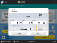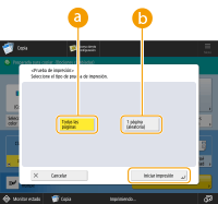No es posible seleccionar <Prueba de impresión> para los trabajos siguientes. Un trabajo que tenga establecido el modo Agrupar o Agrupar y desplazar Un trabajo que espera de copia o en pausa Un trabajo que esté actualmente en copia interrumpida Un trabajo que esté actualmente en copia de muestra Un trabajo que esté actualmente en prueba de impresión Si la copia restante es la última o casi la última, no podrá realizar prueba de impresión seleccionando <Todas las páginas>. Si las páginas de una copia son pocas, es posible que no pueda hacer una prueba de impresión seleccionando <1 página (aleatoria)>. La salida puede tomar tiempo incluso aunque seleccione <Prueba de impresión>. |