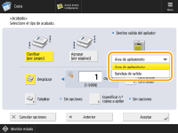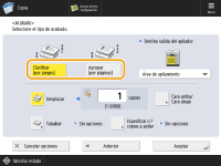 En función de las funciones de acabado, se requiere la instalación de dispositivos opcionales. Equipos opcionales En función del tipo de papel, no podrá utilizar funciones de acabado.Especificaciones de hardware Al colocar un original en el cristal de copia.Si pulsa <Opciones> <Formar trabajo> en la pantalla Funciones básicas de copia, podrá utilizar la función Clasificar/Agrupar aunque el original esté colocado en el cristal de copia.Insertar un separador de trabajos entre cada página durante una impresión de grupoSi selecciona <Agrupar (por páginas)>, puede insertar un separador de trabajos entre cada grupo. Para obtener más información, consulte <Separador trabajos entre grupos>. <Separador trabajos entre grupos> Al configurar las opciones de <Archivos guardados>La función de acabado solo se puede utilizar si imprime un archivo PDF/XPS o un archivo almacenado en el buzón de correo. |