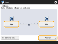 Pulse <Alto> para ajustar el nivel de modo que el texto y las líneas se copien nítidamente, o pulse <Bajo> para copiar tonos medios más suaves en las imágenes impresas, etc.