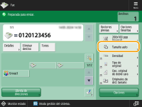 Comprobar el número total de destinos especificadosEn la parte superior derecha de la pantalla se muestra el número total de destinos especificados. Esto le permite confirmar antes de proceder al envío que el número de destinos es correcto. Para enviar con la información del remitentePara consultar los estados de los documentos enviadosCuando <Mostrar notificación cuando se acepta el trabajo> está establecido en <On>, la pantalla <Monitor de estado> puede mostrarse desde la siguiente pantalla mostrada tras la recepción de un trabajo enviado. <Mostrar notificación cuando se acepta el trabajo>Para imprimir el informe de los resultados del envíoEn la pantalla Funciones básicas de fax, al pulsar <Opciones>  <Informe de TX> puede configurar que se imprima automáticamente el informe con la lista de resultados del envío. Para establecer esto para cada trabajo en <Opciones>, es necesario seleccionar <Sólo en caso de error> o <No> en <Informe de TX> y, a continuación, configurar <Permitir impresión desde opciones> en <Sí>. Detectar alim. varias hojas Cuando se introducen múltiples hojasSe detendrá el escaneado y aparecerá el mensaje en pantalla. Siga las instrucciones para eliminar el atasco. Cuando haya eliminado el atasco, aparecerá la pantalla de reanudación de trabajo. Si el equipo detecta erróneamente alimentación múltiple de hojas, pulse <No detectar alimentación de varias hojas> para reanudar el escaneado. Para configurar de antemano que el equipo no le notifique alimentación múltiple de hojas, realice una de las siguientes operaciones. Cada vez que envíe, pulse <Opciones> en la pantalla Funciones básicas de lectura  seleccione <Detectar alim. varias hojas> para deshabilitar el ajuste. Cuando las fotos de la imagen enviada son demasiado oscuras o tienen colores claros en el fondo de color, los originales no pueden eliminarseLa calidad de la imagen enviada puede mejorarse si se cumplen las siguientes condiciones y ajustes. Tipo de trabajo: Fax (Envío desde memoria) o Leer y Enviar (Fax/I-fax) <Selección color>: <Blanco y negro> (Leer y Enviar) <Tipo de original>: <Texto> <Densidad>  <Densidad del fondo>: <Auto> <Resolución>: 200 ppp x 400 ppp, 300 ppp x 300 ppp*, 400 ppp x 400 ppp o 600 ppp x 600 ppp* *Puede establecerse para Leer y enviar |