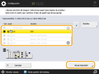 Antes de realizar ajustes, limpie el área de lectura del cristal de copia y del alimentador. Limpiar el alimentador Utilice las siguientes condiciones para imprimir la página de prueba. Es posible que no se obtengan resultados de ajuste precisos si la página de prueba no se imprime correctamente. Tamaño de papel: de 100 mm × 148 mm a 297 mm × 762 mm Acabado: No estucado, Reciclado, Tela Tipo: Normal, Membrete Gramaje básico: de 52 a 220 g/m2 Si imprime la página de prueba en papel de un tamaño diferente al del papel designado, es posible que la posición de la imagen no se ajuste correctamente. Si un borde de la página de prueba está mal cortado o plegado, o la imagen no se imprime correctamente en la página de prueba, puede aparecer el mensaje <Ponga correctamente la página de prueba en el cristal.> durante el proceso de lectura. Puede suceder que el ajuste no se realice correctamente con algunos tipos de papel, como papel gofrado de superficie tosca o papel de colores. Si el ajuste no se realiza correctamente cuando se ha seleccionado <Usar escáner>, seleccione <No usar escáner> en su lugar. En los siguientes casos, la página de prueba no puede escanearse correctamente y no se puede realizar el ajuste: Cuando se escanea, la página de prueba está torcida El tamaño del papel es de tipo EXEC o G-LGL, el cual se puede torcer durante el escaneado porque la guía del papel no puede fijarse. |