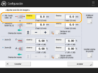 Cuando vuelva a abrir la pantalla después de haberla cerrado pulsando <Aceptar>, los valores de la pantalla volverán a '0'. Sin embargo, el valor ajustado todavía será efectivo en cada campo Total. Si repite el paso, compruebe la longitud de 'e' en la nueva página de prueba e introduzca el nuevo valor. |