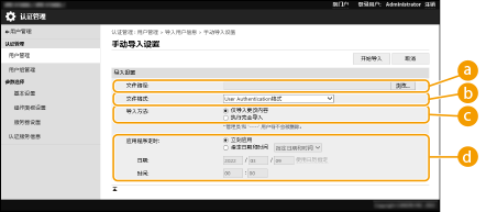 导入从具有高级存储箱用户访问控制的佳能机器导出的用户信息。文件扩展名为"csv"。