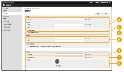 通过操作面板配置设置也可以按  (设置/注册)  <管理设置>  <用户管理>  <认证管理>  <注册/编辑认证用户>注册用户信息。 <注册/编辑认证用户>创建用户组“地址簿”中的“地址列表”可以在用户组中注册的用户之间共享。 注册用户组 |
