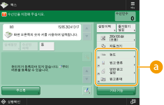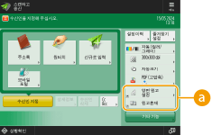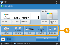 기본 특징 화면에 있는 설정 항목의 수와 표시될 위치는 기능에 따라 달라집니다. <할당없음>을 단축키로 설정하면 단축키 버튼이 표시되지 않습니다. 등록할 수 있는 <기타 기능>에 대한 단축키의 수는 다음과 같이 제한됩니다. 복사(기본): 5 복사(고속): 6 스캔 및 전송: 2 복사 기본 기능 화면을 고속 복사 화면(설정을 빠르게 변경(고속 복사 화면))으로 변경했으면 3단계의 버튼을 선택하고 <등록>을 누릅니다. |
