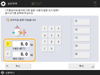 <X> 또는 <Y>를 눌러서 숫자 키를 사용하여 양쪽의 길이를 입력합니다. ![]() 자주 사용하는 용지 크기를 <S1>부터 <S5>까지 버튼에 등록하면 원터치로 불러낼 수 있습니다. 프리 사이즈 용지 등록(사용자 정의 크기 용지) | |