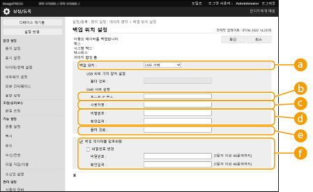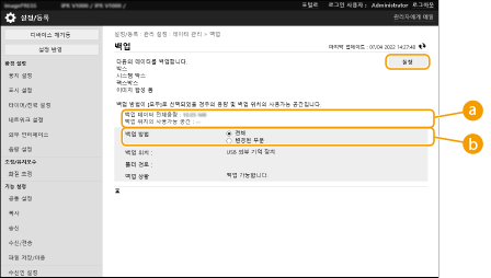 백업한 데이터를 변경하거나 삭제하지 마십시오. 데이터의 정상적인 복원이 불가능 할 수 있습니다. 조작 패널 또는 리모트 UI를 통해 기기를 작동 중일 때에는 백업을 실행하지 마십시오. |